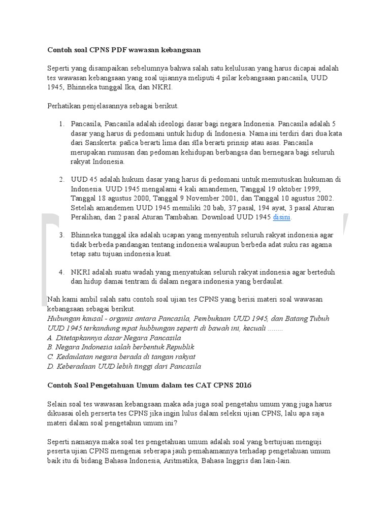 Download Latihan Cat Gratis Soal Cpns 2016 2019 04 01 Download Contoh Dan Prediksi Lengkap Soal Pdf Document from reader020.staticloud.net Namun sebelum berlanjut pada isi contoh soal skb cpns pupr 2020, ada baiknya kamu mengenali dahulu kapan tepatnya pelaksanaan skb tersebut seperti yang mamikos kamu sudah tidak sabar bukan untuk mengetahui apa saja contoh soal skb cpns pupr 2020 yang sudah mamikos himpun? Nilai skb ini kemudian akan digabungkan. Uud 1945 juga mempunyai fungsi dan perubahan sebagai alat control yang berarti a. Simak dan pahami tata cara penyelesaiannya. Model ini akan muncul antara 2016 atau 2017 mendatang. Pembukaan uud 1945 alinea 4 6. Contoh soal cpns, cpns 2016, soal cpns tiu. Melakukan demonstrasi secara anarkis c.