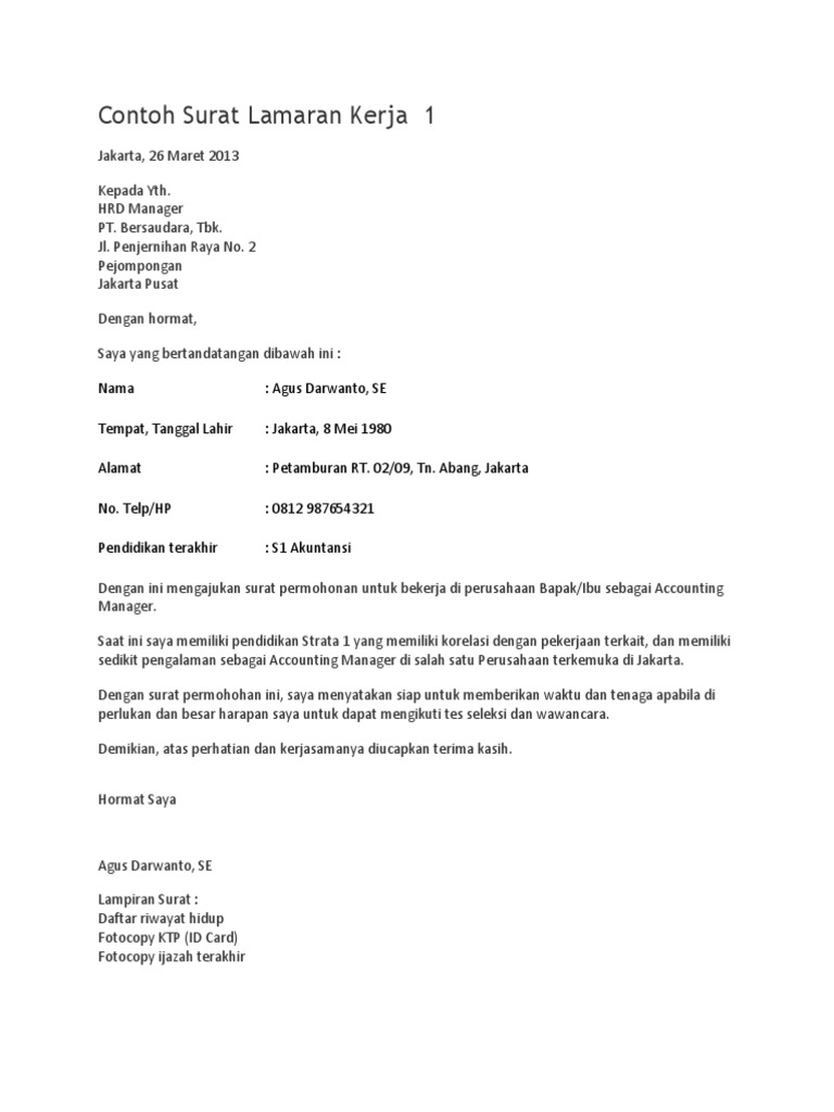 Contoh surat lamaran kerja yang baik dan benar sesuai dengan eyd (ejaan yang disempurnakan) untuk melamar pekerjaan di berbagai instansi baik bumn maupun swasta lengkap dengan file.doc siap untuk didownload dan diprint out/cetak. Apalagi bila anda sudah berkeluarga dan anda adalah seorang suami. Bersama surat lamaran kerja ini saya bermaksud untuk melamar pekerjaan di pt. Contoh surat lamaran kerja untuk freshgraduate. Surat pengantar yang dipakai dalam koneksi.